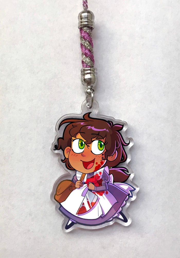 1.5" laser cut charm, surprisingly sturdy, perfect for cell phones or keychains or bags! Clear acrylic double-sided print. Includes mini-lanyard.
