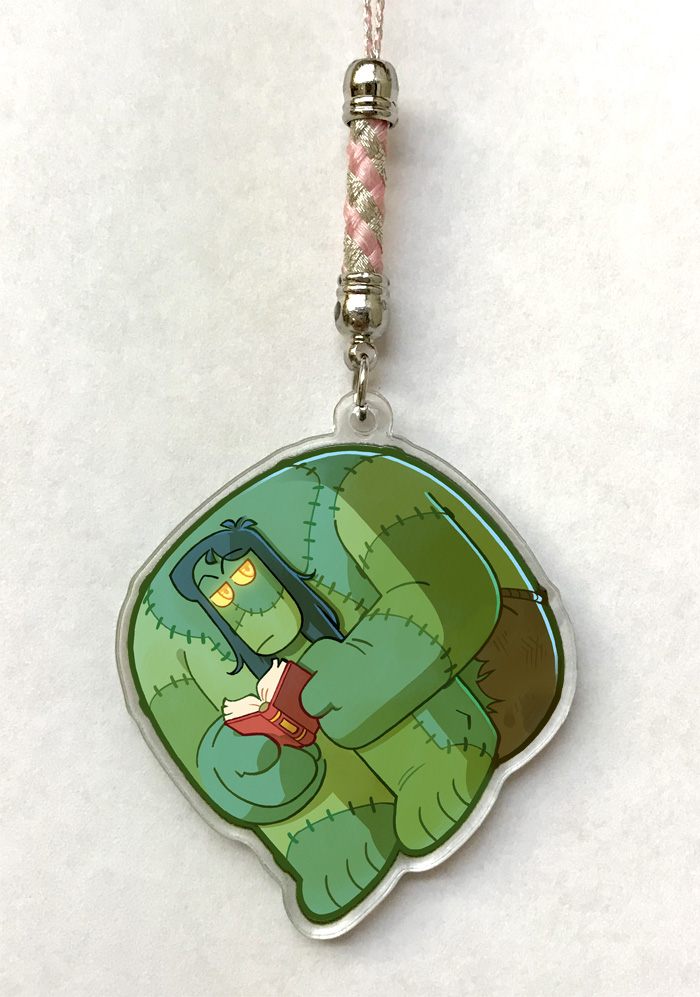 1.5" laser cut charm, surprisingly sturdy, perfect for cell phones or keychains or bags! Clear acrylic double-sided print. Includes mini-lanyard.