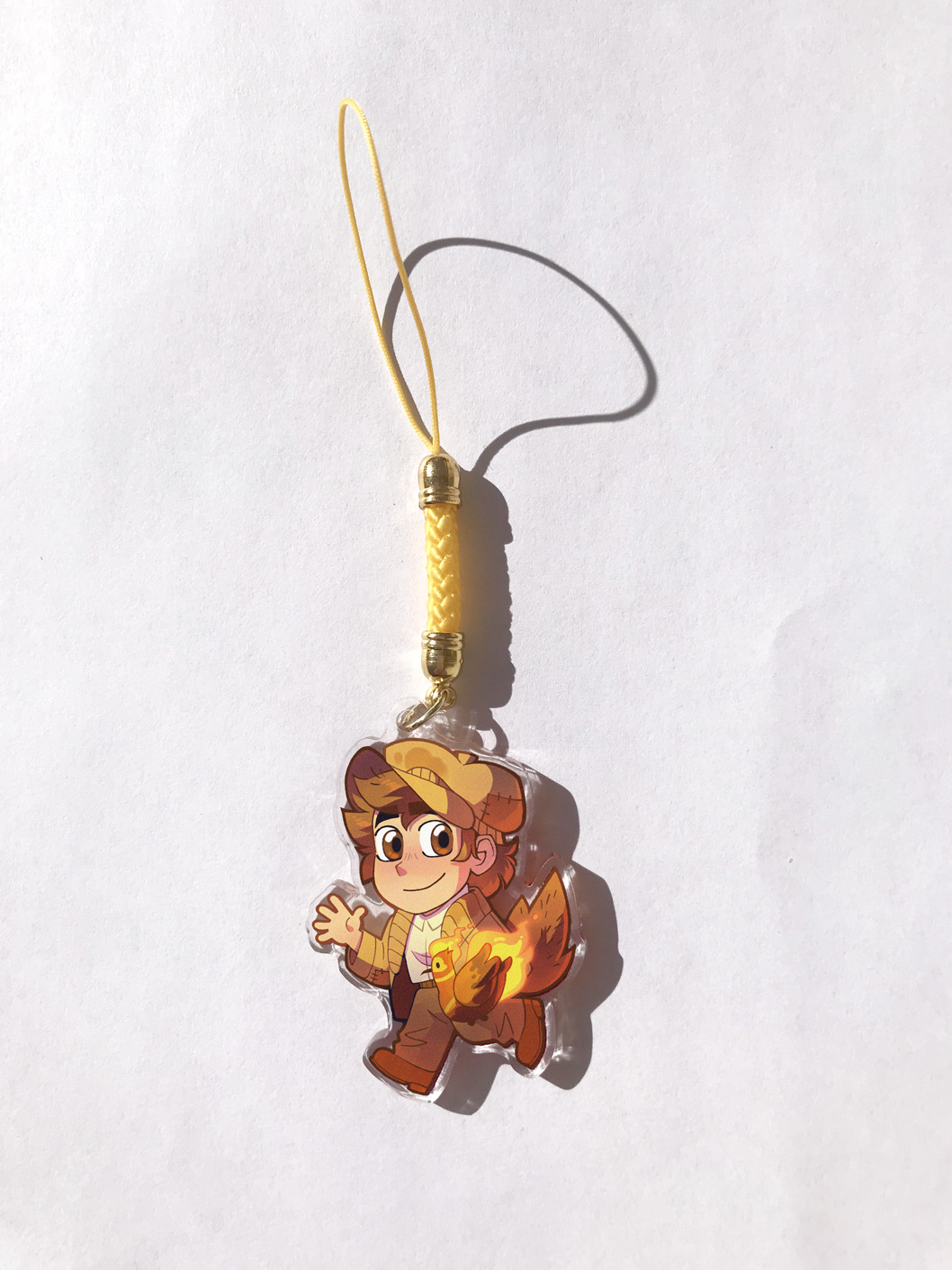 1.5" laser cut charm, surprisingly sturdy, perfect for cell phones or keychains or bags! Clear acrylic double-sided print. Includes mini-lanyard.
